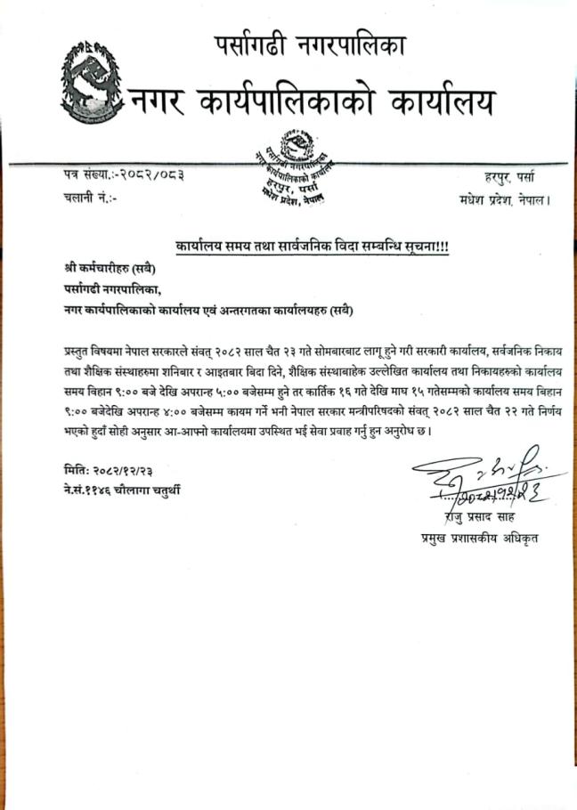 कार्यालय समय तथा सार्वजनिक विदा सम्बन्धी सूचना ।