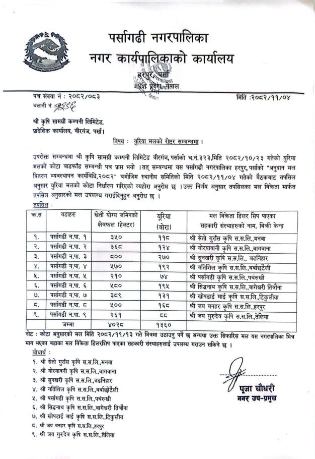 युरिया मलको रोष्टर बाँडफाँड सम्बन्धमा ।