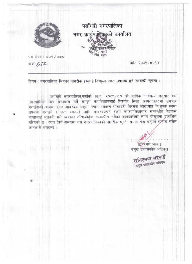 » नगरपालिका भित्रका नागरीकहरुलाई निःशुल्क रगत उपलब्ध हुने सम्बन्धी सूचना ।