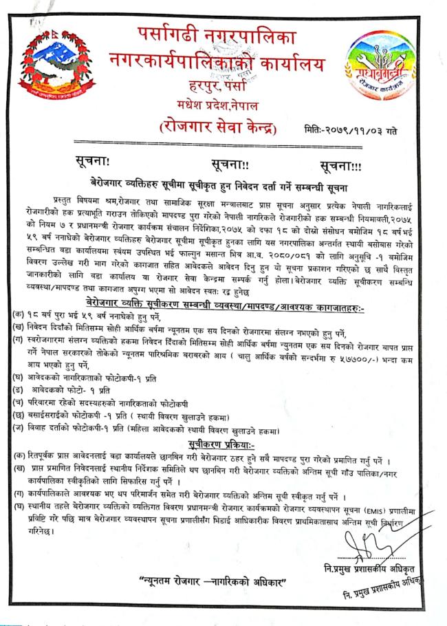 बेरोजगार वयक्तिहरु सूचीकृत हुन निवेदन दर्ता गर्ने सम्बन्धी सूचना ।