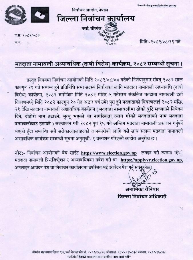 मतदाता नामावली अध्यावधिक ( दाबी बिरोध ) कार्यक्रम, २०८२ सम्बन्धी सूचना ।