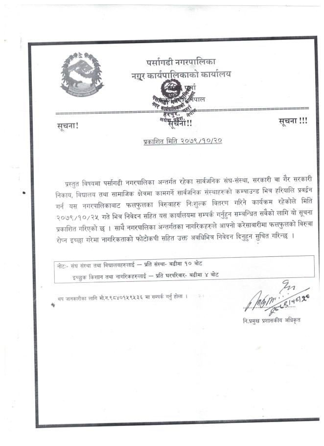 यस नगरपालिकाबाट फलफुका विरुवाहरु निःशुल्क विवतरण गरिने कार्यक्रम रहेकोले मिति २०७९/१०/२५ गते भित्र निवेदन सहित यस कार्यालयमा सम्पर्क गर्नुहुन सम्बन्धित सबैको लागि यो सूचान प्रकाशित गरिएको छ ।
