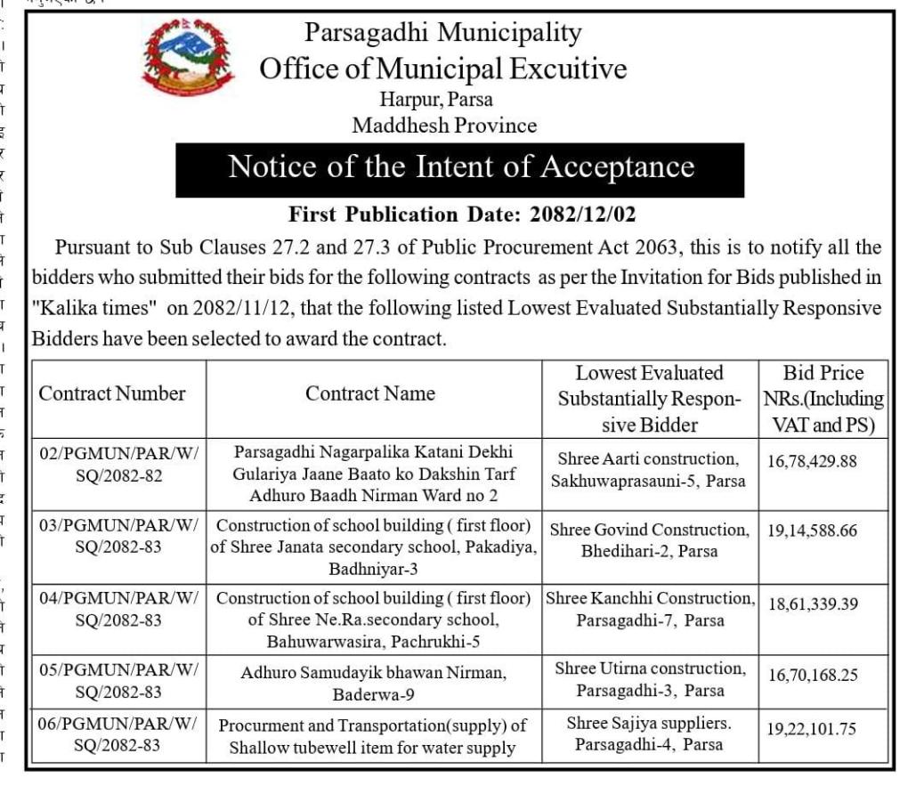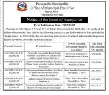 » शिलबन्दी दरभाउपत्र स्विकृत गर्ने आशयको सुचना ।