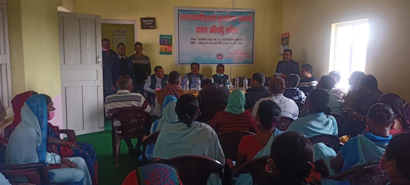 आज मिति २०७८/०८/०७ गते मंगलवारका दिन नगरपालिका हरपुर पर्साको आयोजनामा स्वास्थ्य शाखाको व्यवस्थापनमा स्वास्थ्यकर्मीहरुको बृहतपोषण सम्बन्धी क्षमता अभिबृद्बि सम्बन्धी मिति २०७८/८/७ गते देखि २०७८/०८/१3 गते सम्म संचालन हुने ७ दिने तालिममा विशिष्ट अथिती प्रमुख प्रशासकिय अधिकृत श्री भरत प्रसाद यादवज्यू, प्रमुख अथिती नगरप्रमुख श्री लोकनारायण यादवज्यू तथा वडा नं.२ का वडा अध्यक्ष श्री बेदमन दासज्यूको अध्यक्षतामा तपशिल बमोजिमको उपस्थिती सहित तालिम उदघाटन शत्र संचालन गरियो ।