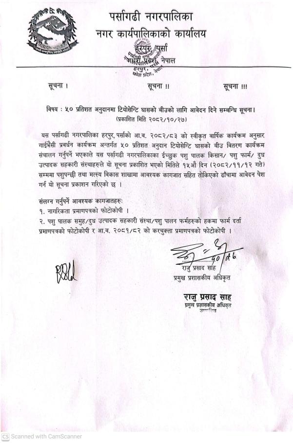५० प्रतिशत अनुदानमा टियोसेन्टि घासको बिउँको लागि आवेदन दिने सम्बन्धि सूचना ।